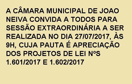 O Presidente da Câmara Municipal de João Neiva, através do Ato da Presidência nº 046/2017, considerando os termos do Ofício GP/PMJN nº 373/2017, encaminhado pelo Exmo. Sr. Prefeito Municipal, convocou os Vereadores para Sessão Extraordinária a realizar-se no dia 27/07/2017, quinta-feira, às 09 horas, no Plenário da Câmara, tendo como tema as seguintes matérias: